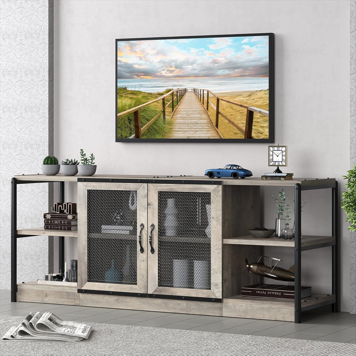 Grey Industrial TV Stand for 65 inch TVs with Mesh Door & Storage, Rustic Console Table for Living Room