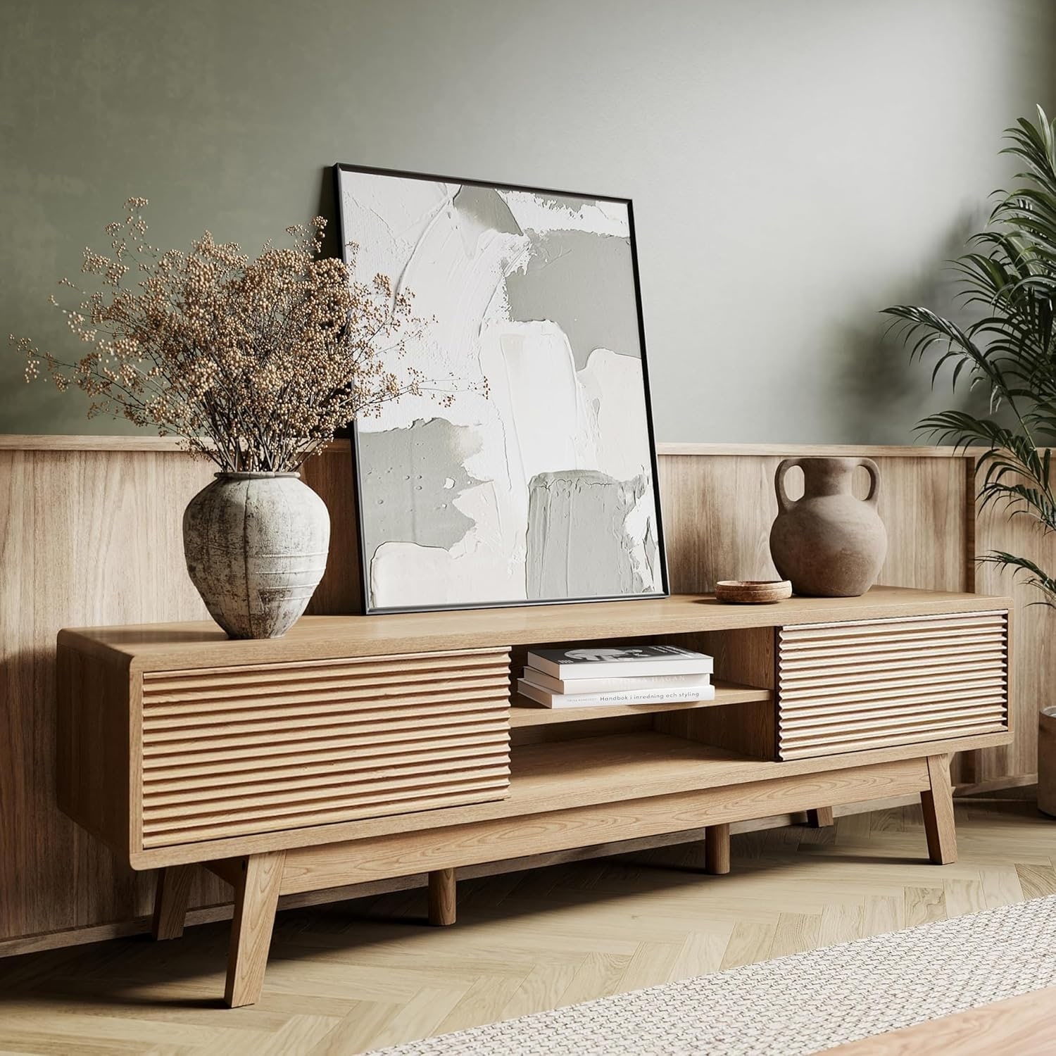 59" Mid Century TV Stand for 55-65" TVs, Wooden Low Profile Console with Sliding Doors & Open Shelves