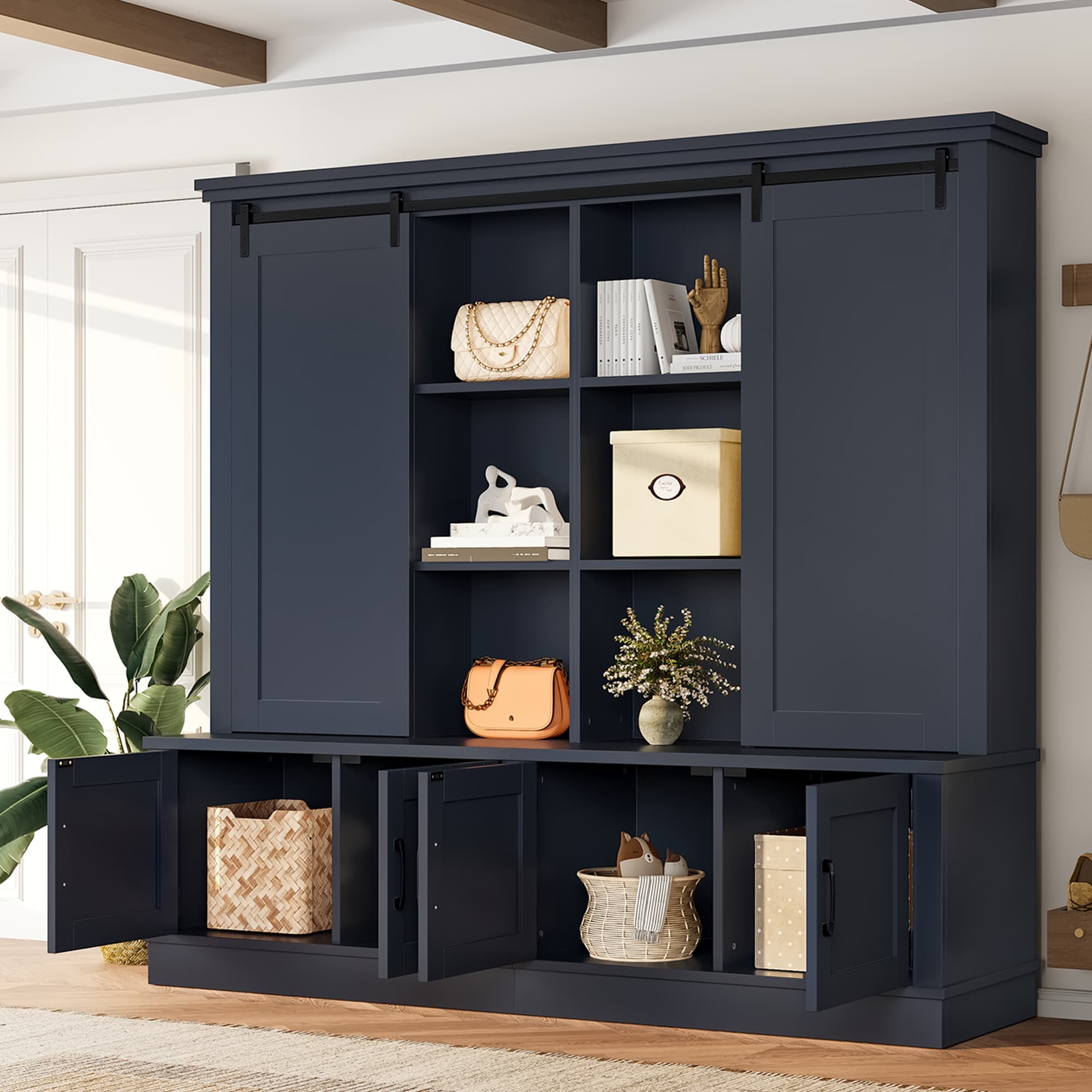 Roomfitters Large Entryway Hall Tree with Sliding Barn Door, Storage Cabinet with Shelves and Shoe Rack