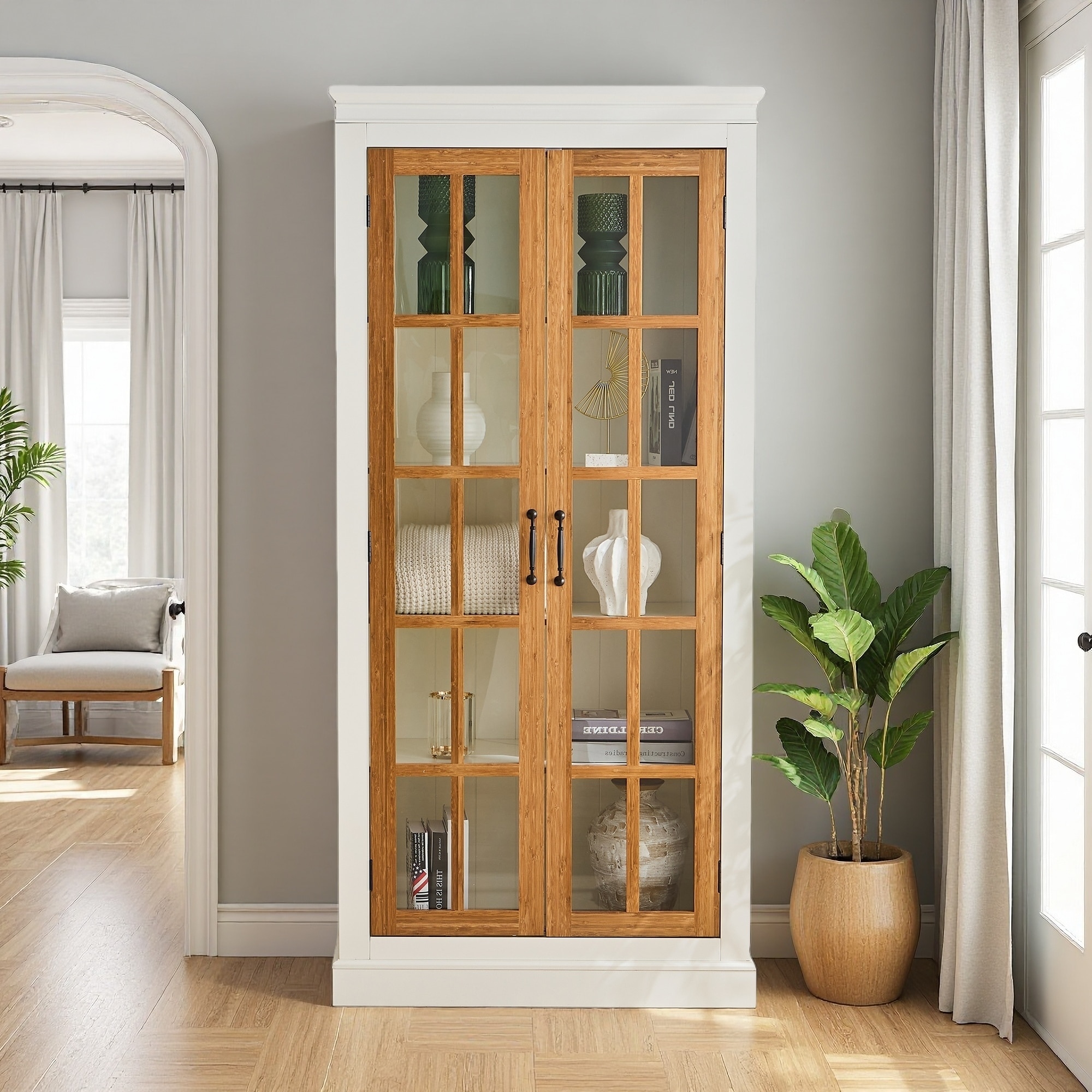 71.2"H Freestanding Pantry Cabinet, Glass Doors, Adjustable Shelves, Curio Cabinet