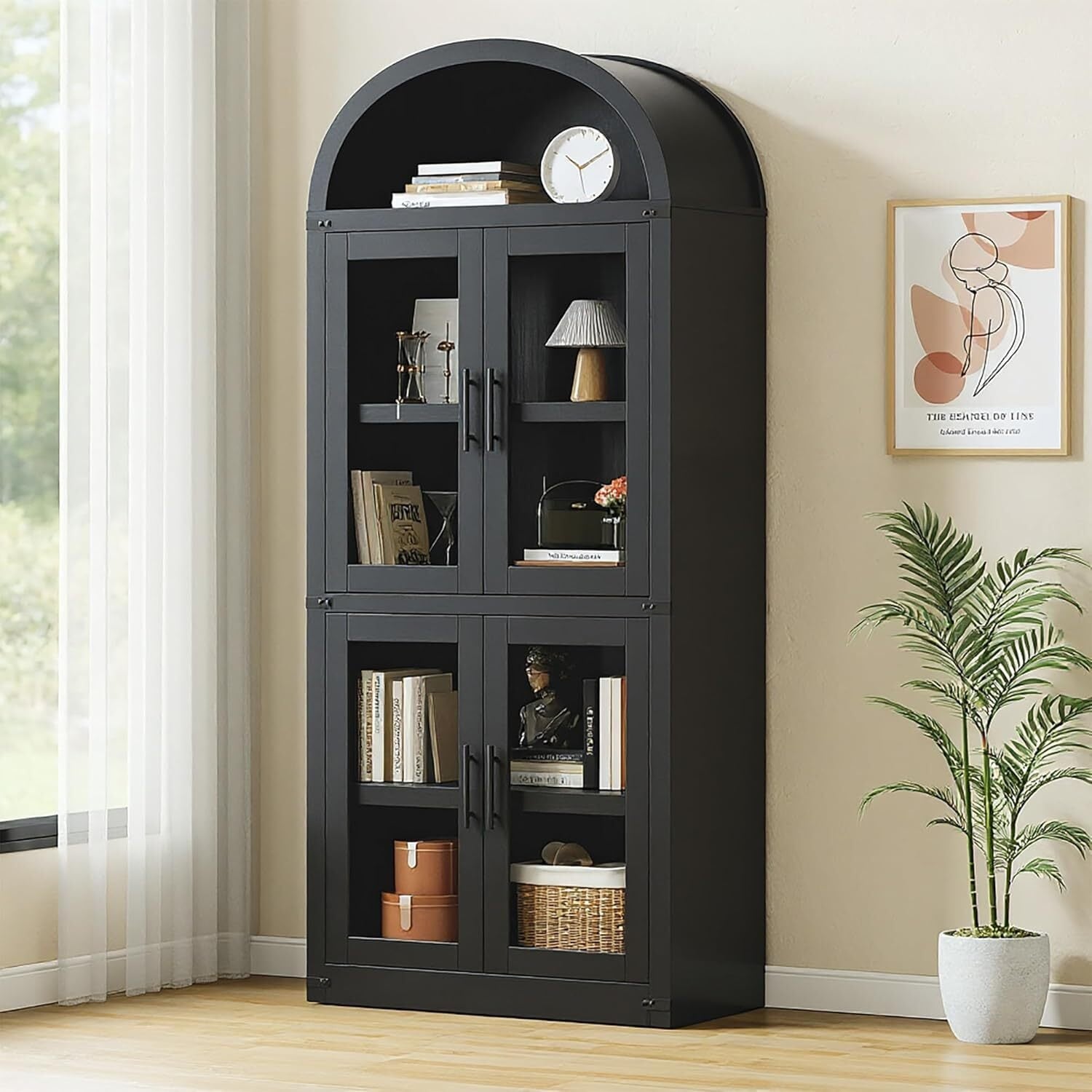 71.65in Arched Bookshelf with Doors, 5-Shelf Farmhouse Bookcase, Tall Wooden Display Cabinet