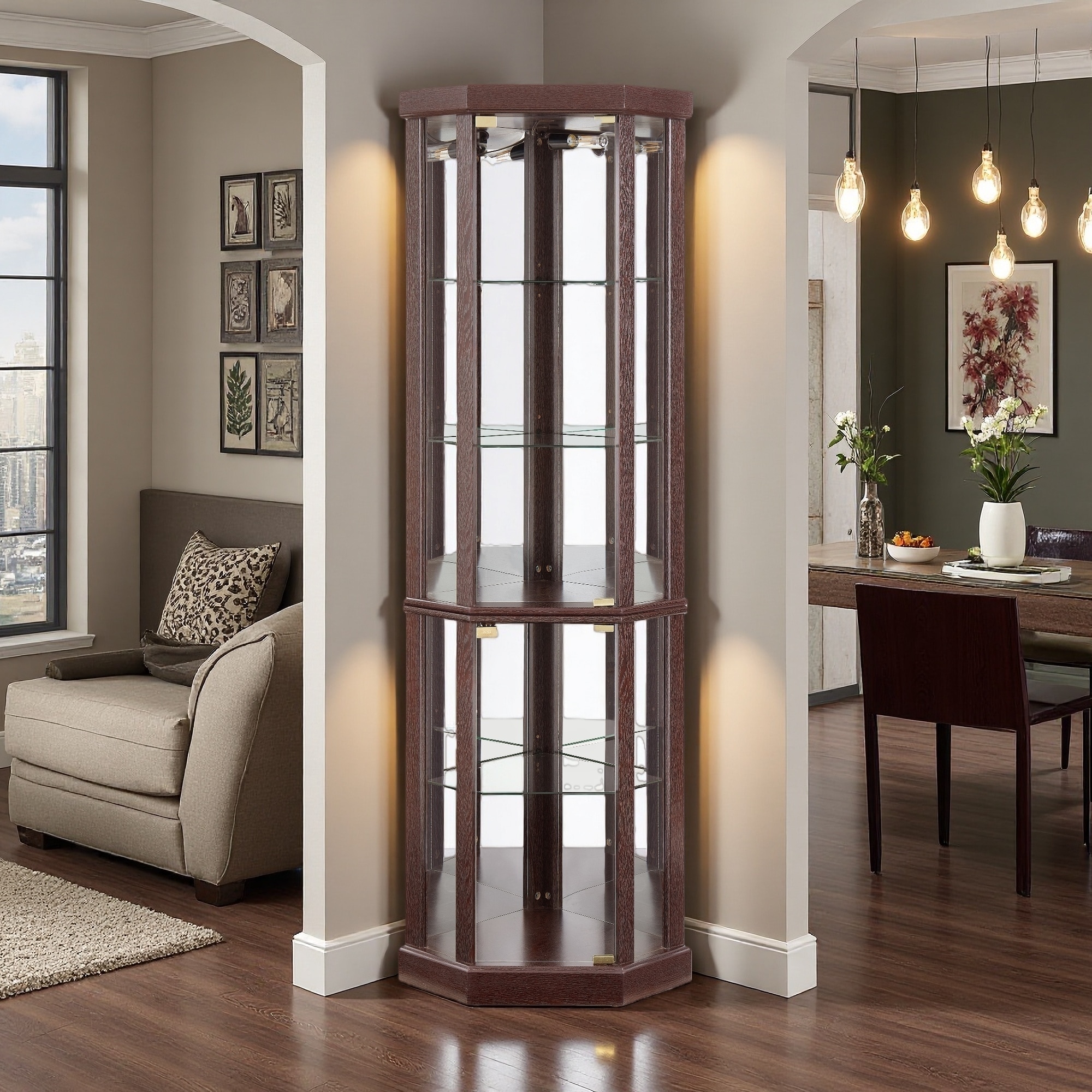 69.84"H Lighted Glass Corner Curio Cabinet with Adjustable Shelves, Built-in Lighting, Magnetic Closure and Anti-toppling Device