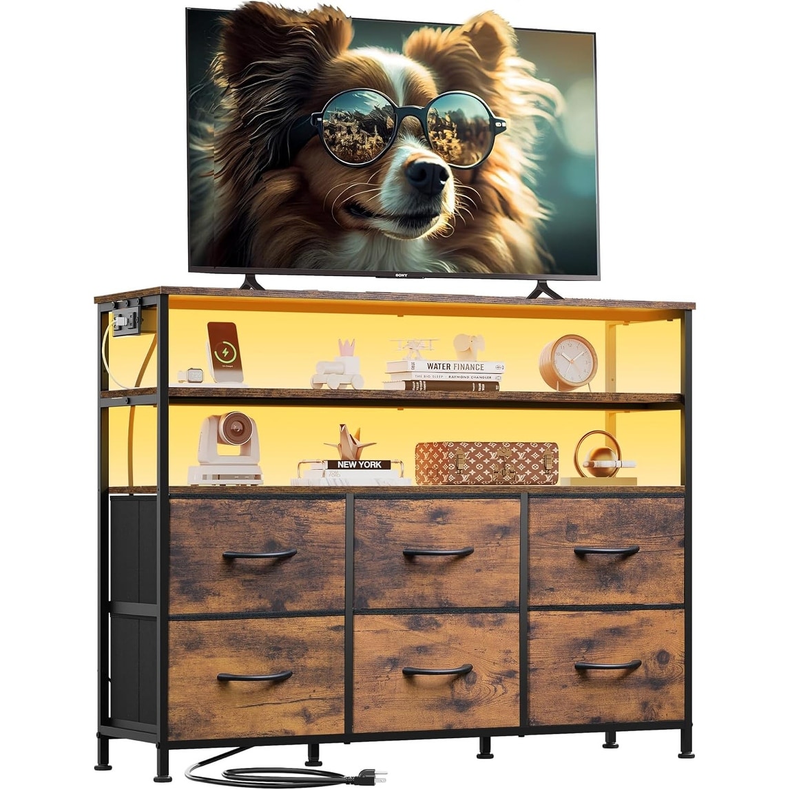 TV Stand for 40-45" with LED Lights & Charging, 6 Fabric Drawers, Open Shelves, Rustic Brown
