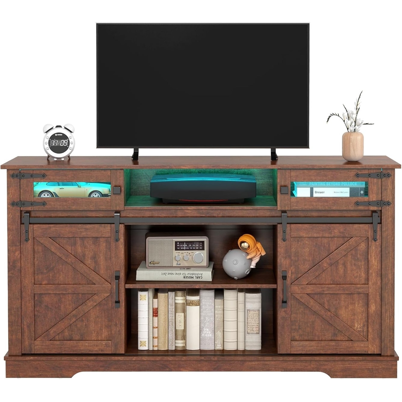 TV Stand with LED Lights, 33" Tall Entertainment Center, Sliding Barn Doors, Open Storage Shelves for Living Room