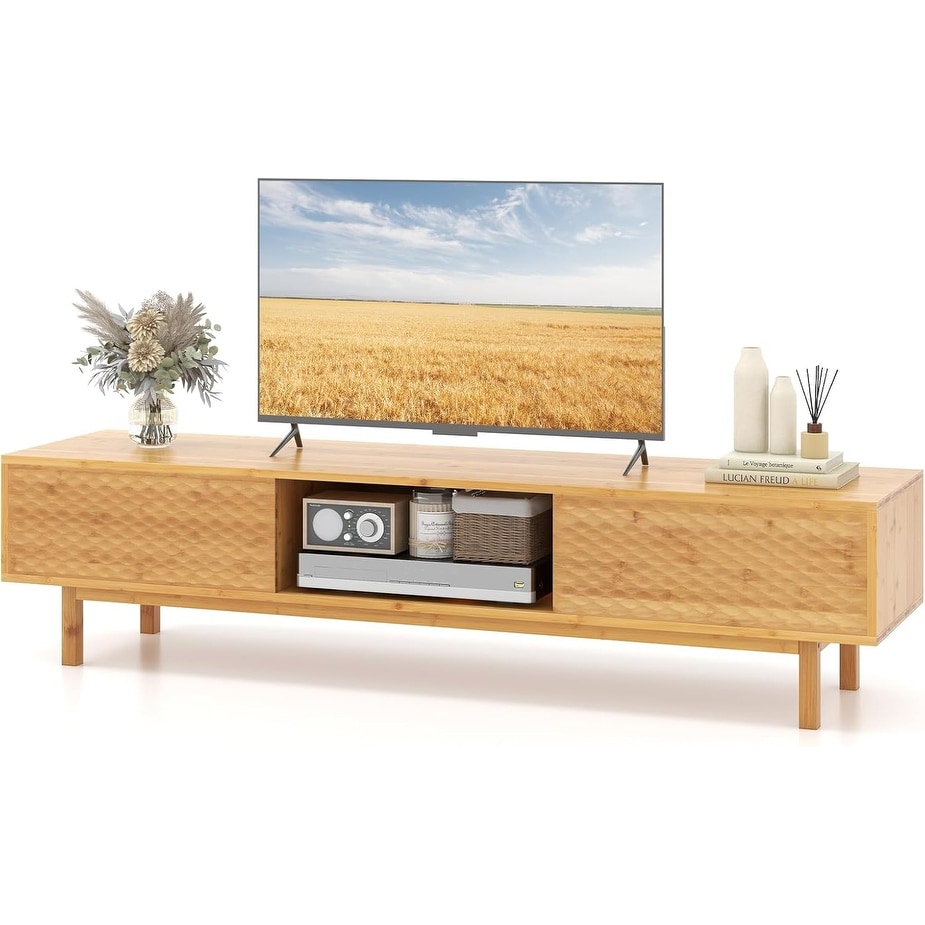 Bamboo TV Stand for 65" 70" TVs, 63" Modern Console with Sliding Doors & 3 Compartments (Natural)