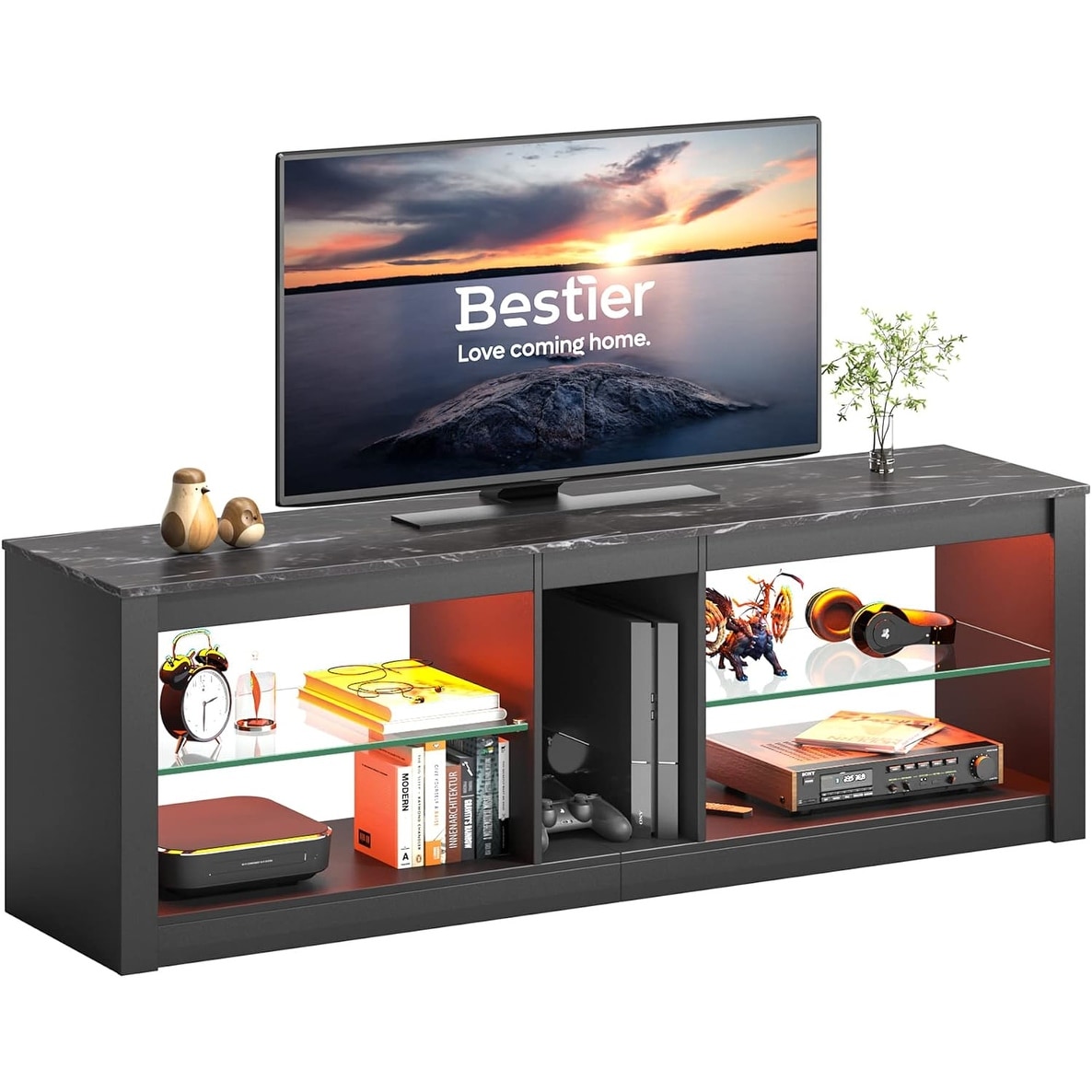 LED Gaming TV Stand for 55+ Inch with Adjustable Glass Shelves, 22 RGB Modes, Black Marble