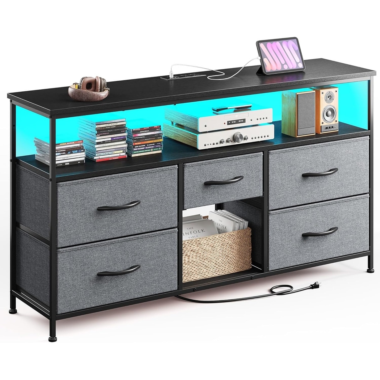 TV Stand with LED Lights & Power Outlets, 5-Drawer Media Console for Living Room or Bedroom, Fits 50" TV