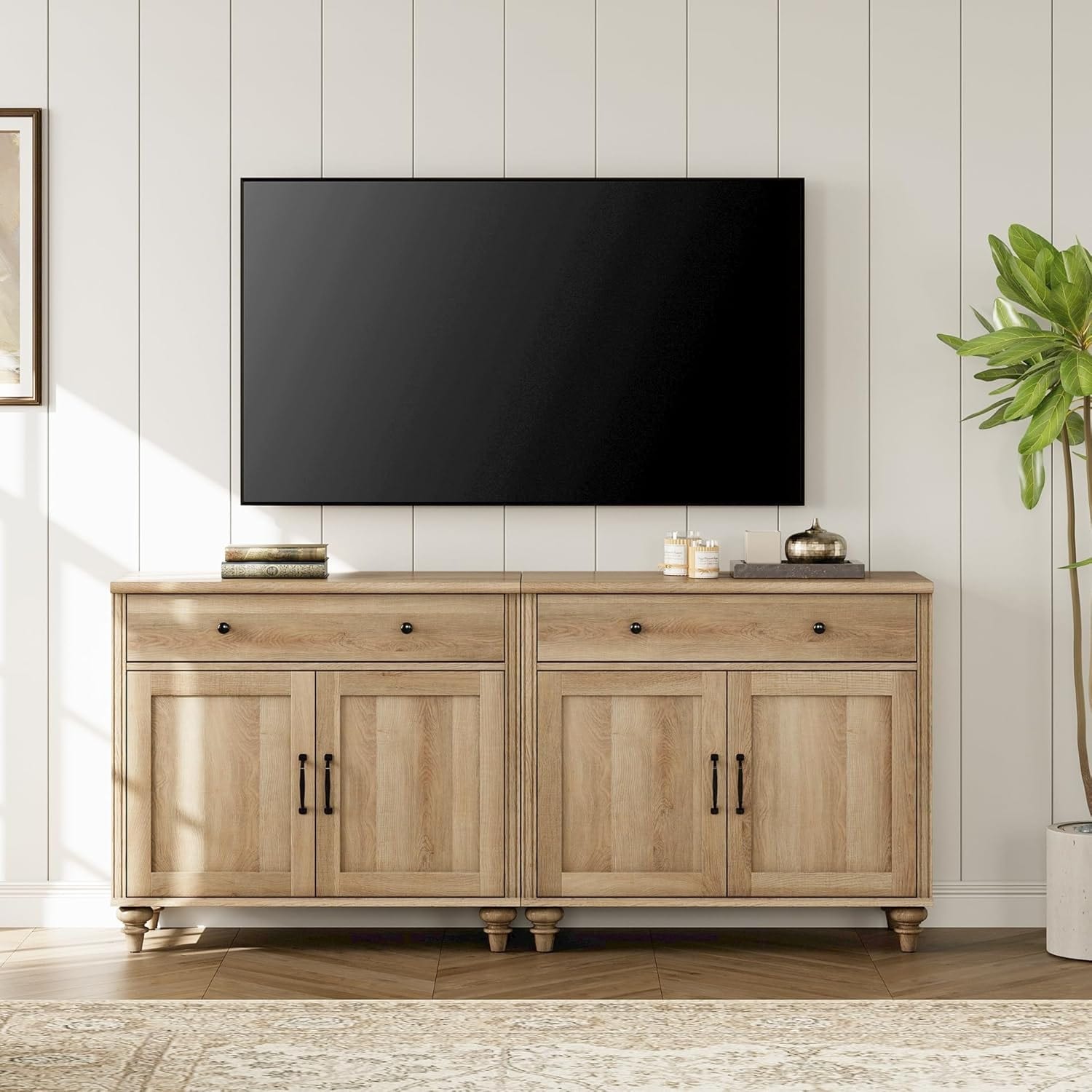 TV Stand for 75" Screens, Boho Wood Console with Sliding Doors & Shelves, Media Cabinet for Living Room or Bedroom, Natural