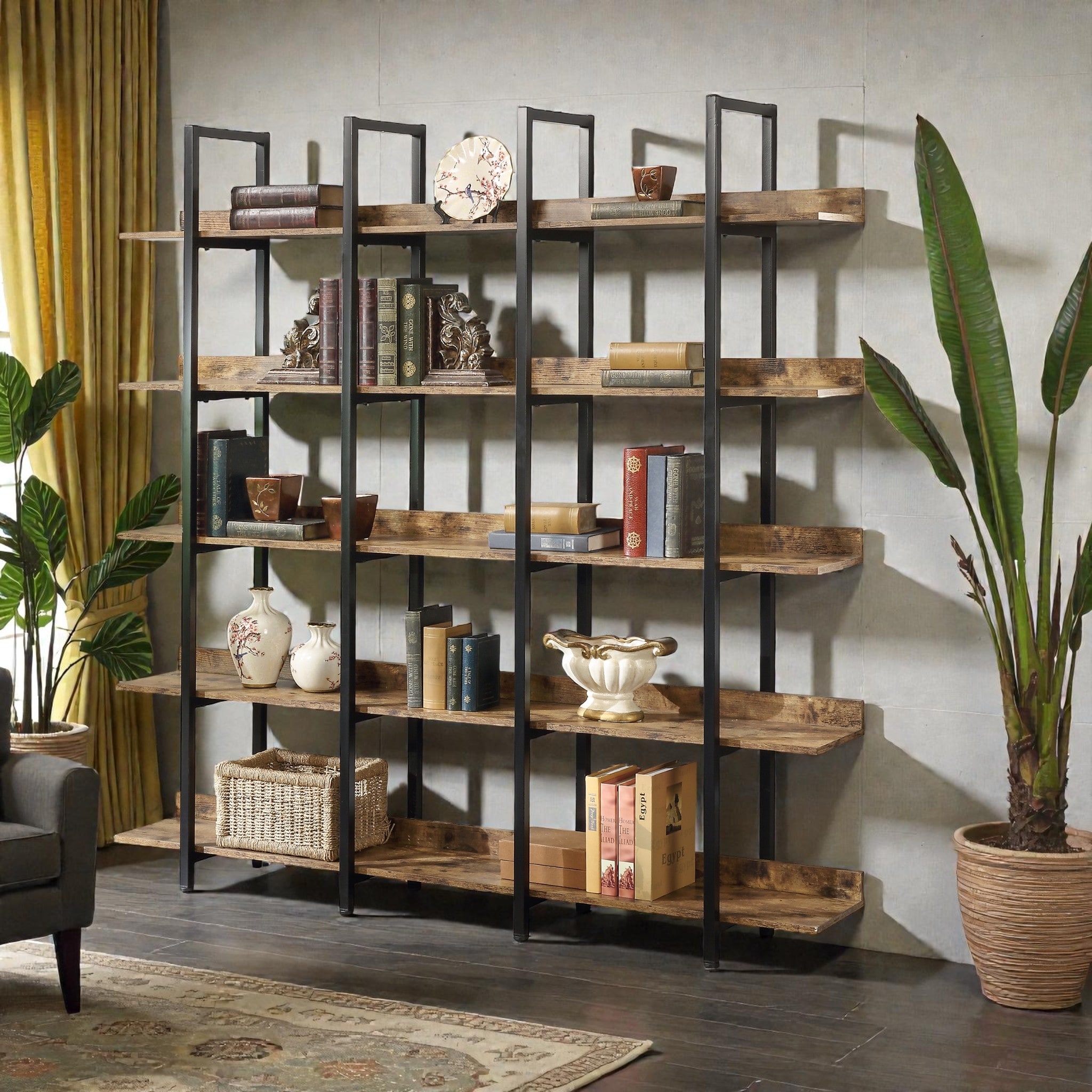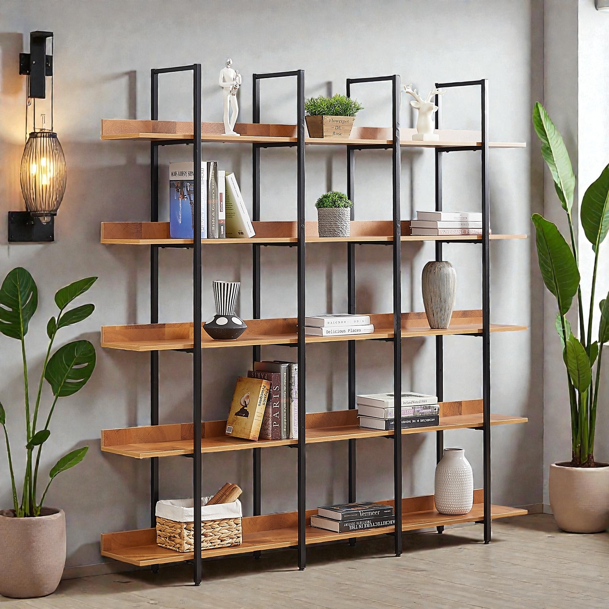 5 Tier Industrial Bookcase, Open Home Office Bookshelf with Metal Frame and MDF Shelves, Vintage Style