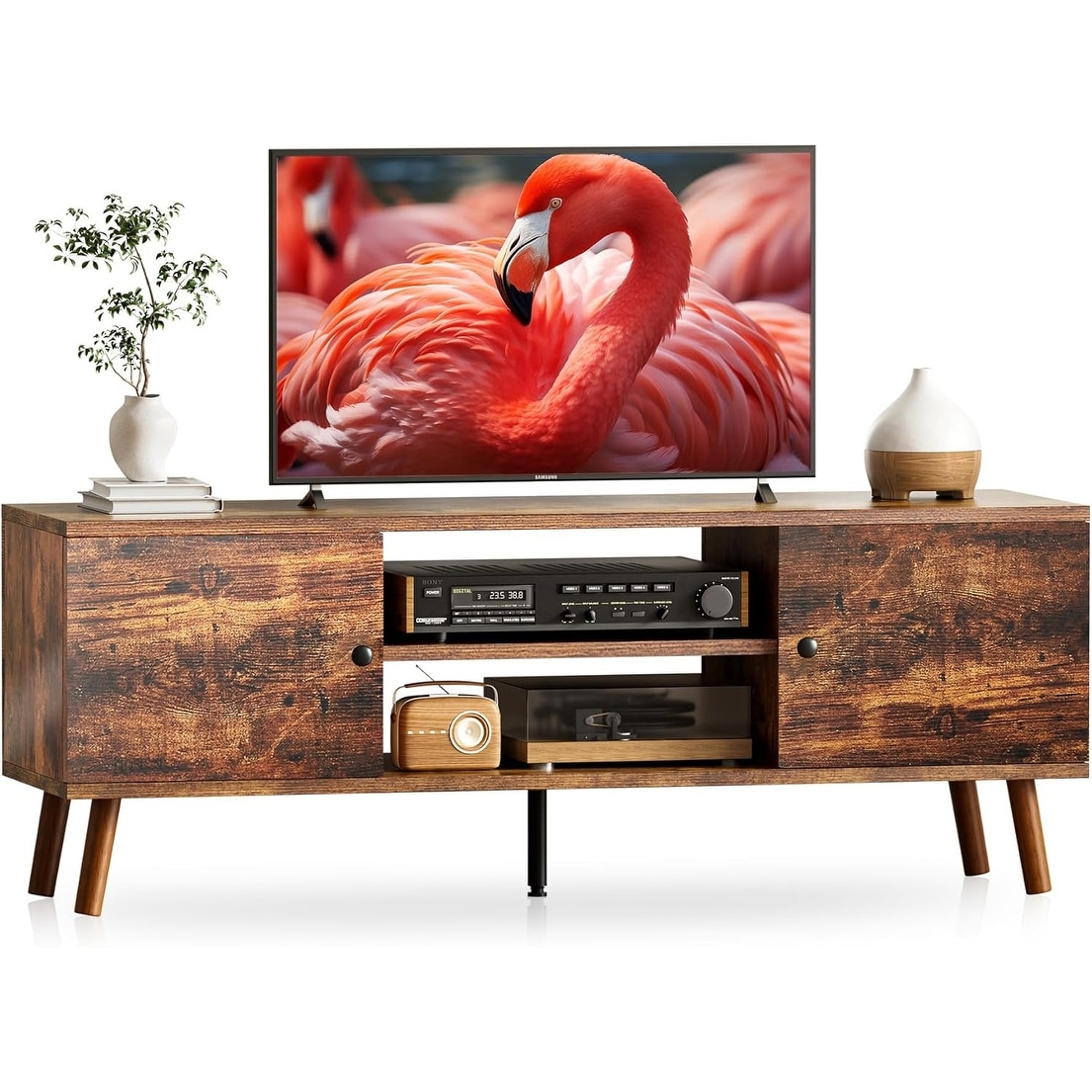 Living Room TV Stand for 40-60 inch, 2-Cabinet Media Console with Storage, Soft Hinge Doors, Wood Feet - Brown