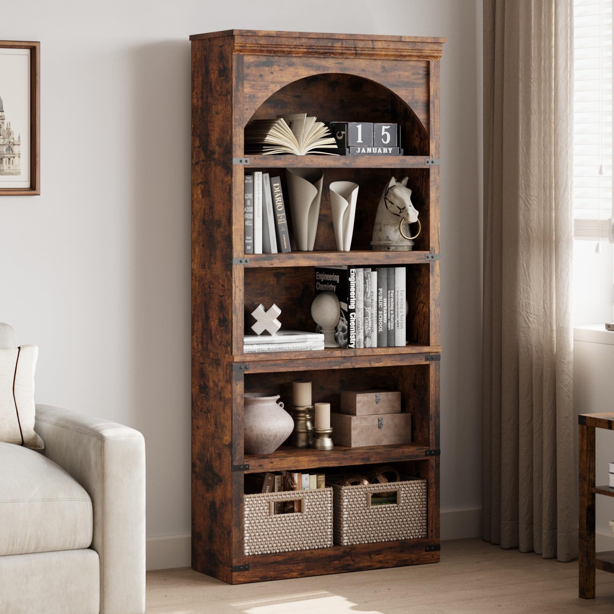 5 Shelf Bookcase Arched Bookshelf, Rustic Wood Look Storage Shelf for Home Office Living Room, Easy Assembly