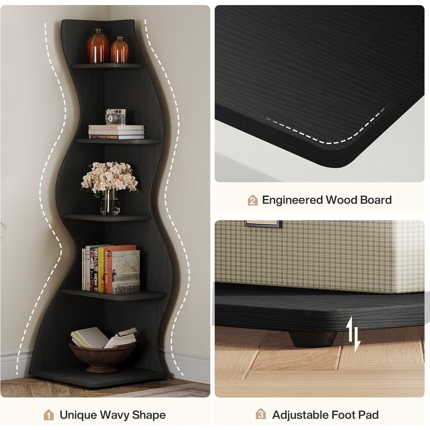 69.8"Height 5-Tier Wavy Black Corner Bookshelf and Plant Stand for Living Room Small Space