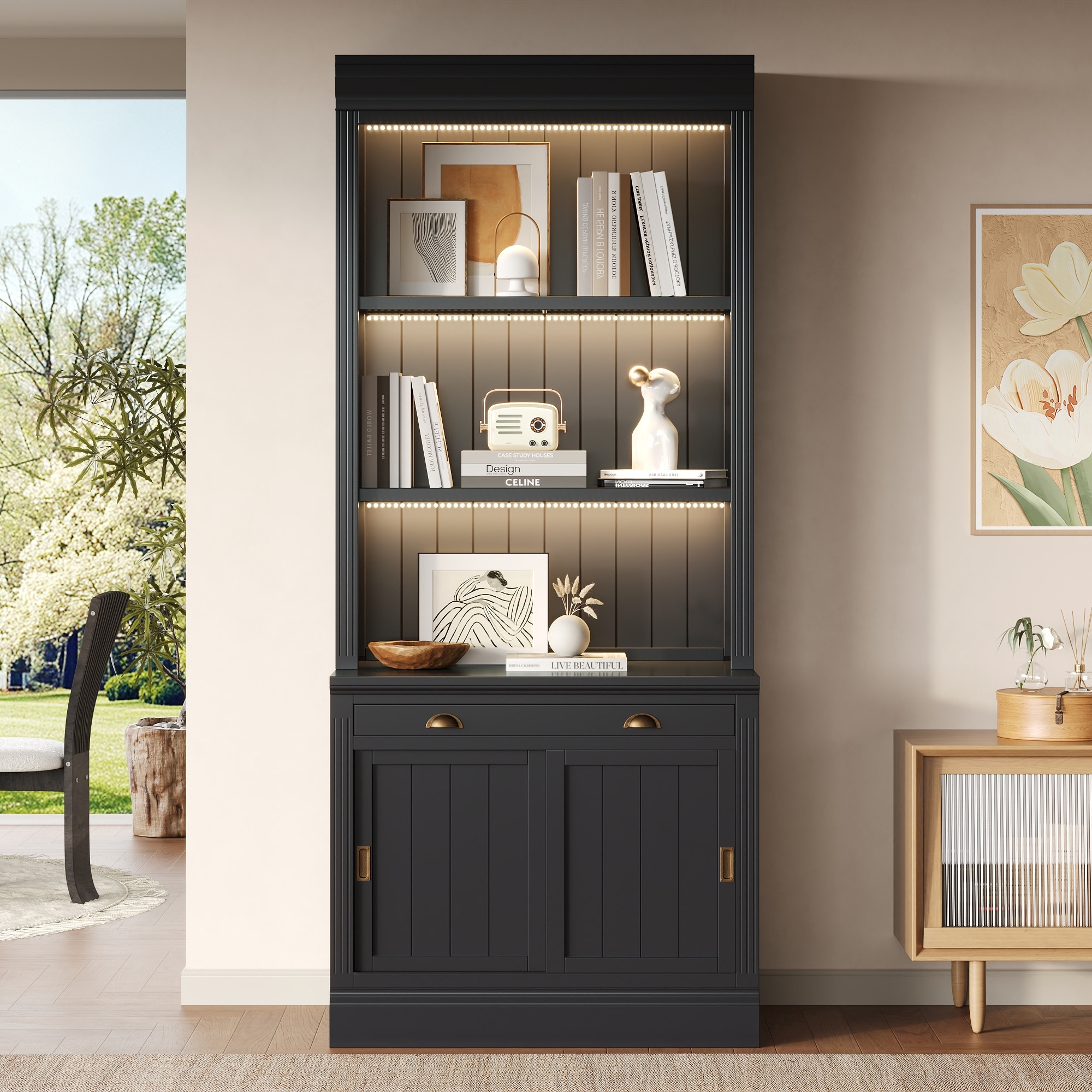 83.4"Tall Bookshelf with with 3 pieces LED Lighting, Modern Bookcase with Sliding Doors and Open Shelves,Storage Bookshelf for L