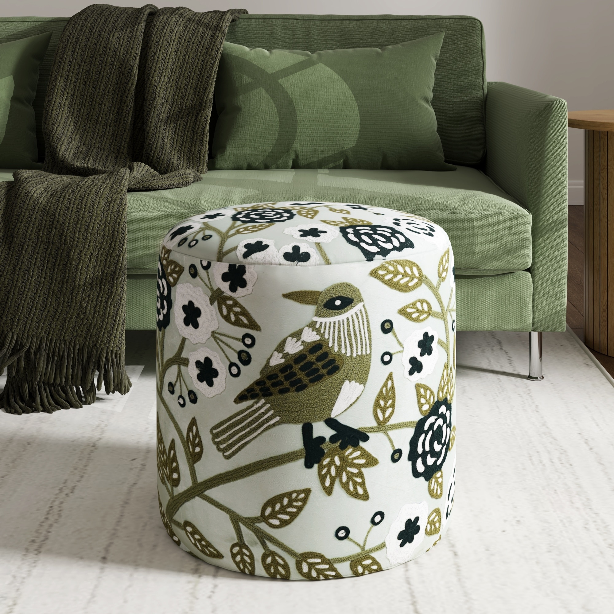 Handmade Embroidered Round Pouf Ottoman - 18" - Cream and Green