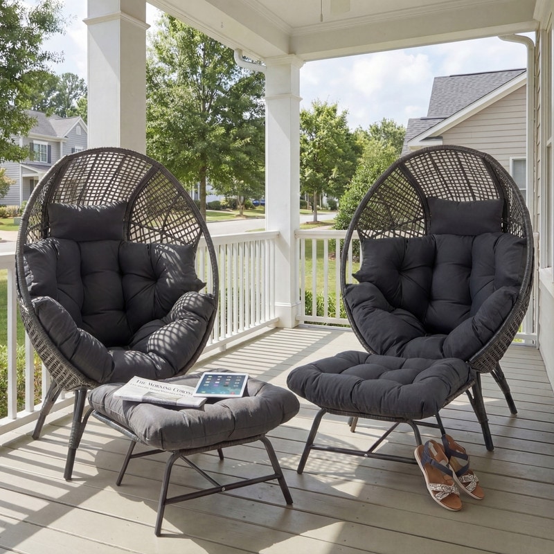 Set of 2 Outdoor Wicker Egg Chairs with Ottomans, 4-Piece Patio Lounge Chair Set, 6.5" Thick Cushions, 440 lbs Capacity