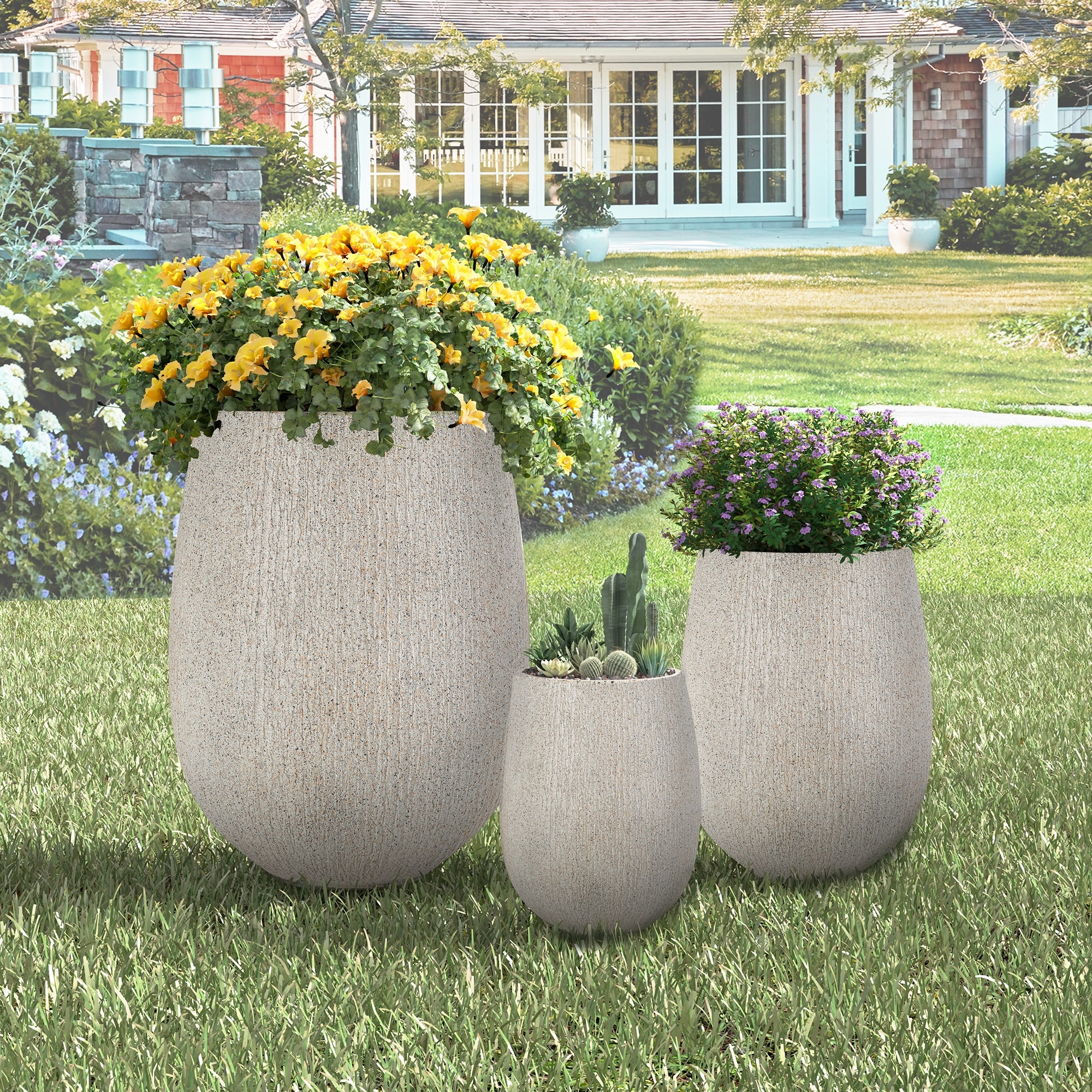 Egg-Shaped Lightweight MGO Outdoor Planter Set of 3,Modern Stone-Look Textured Flower Pots with Drainage Holes and Rubber Plug