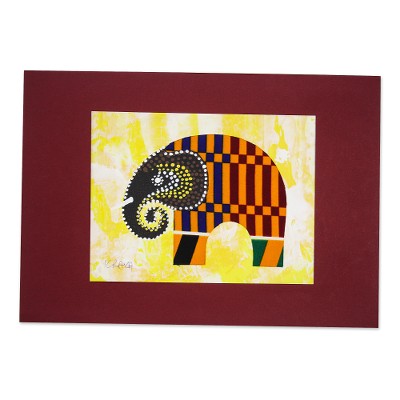 Kente Elephant,'Elephant Painting with Kente Cloth Cotton Accent from Ghana'