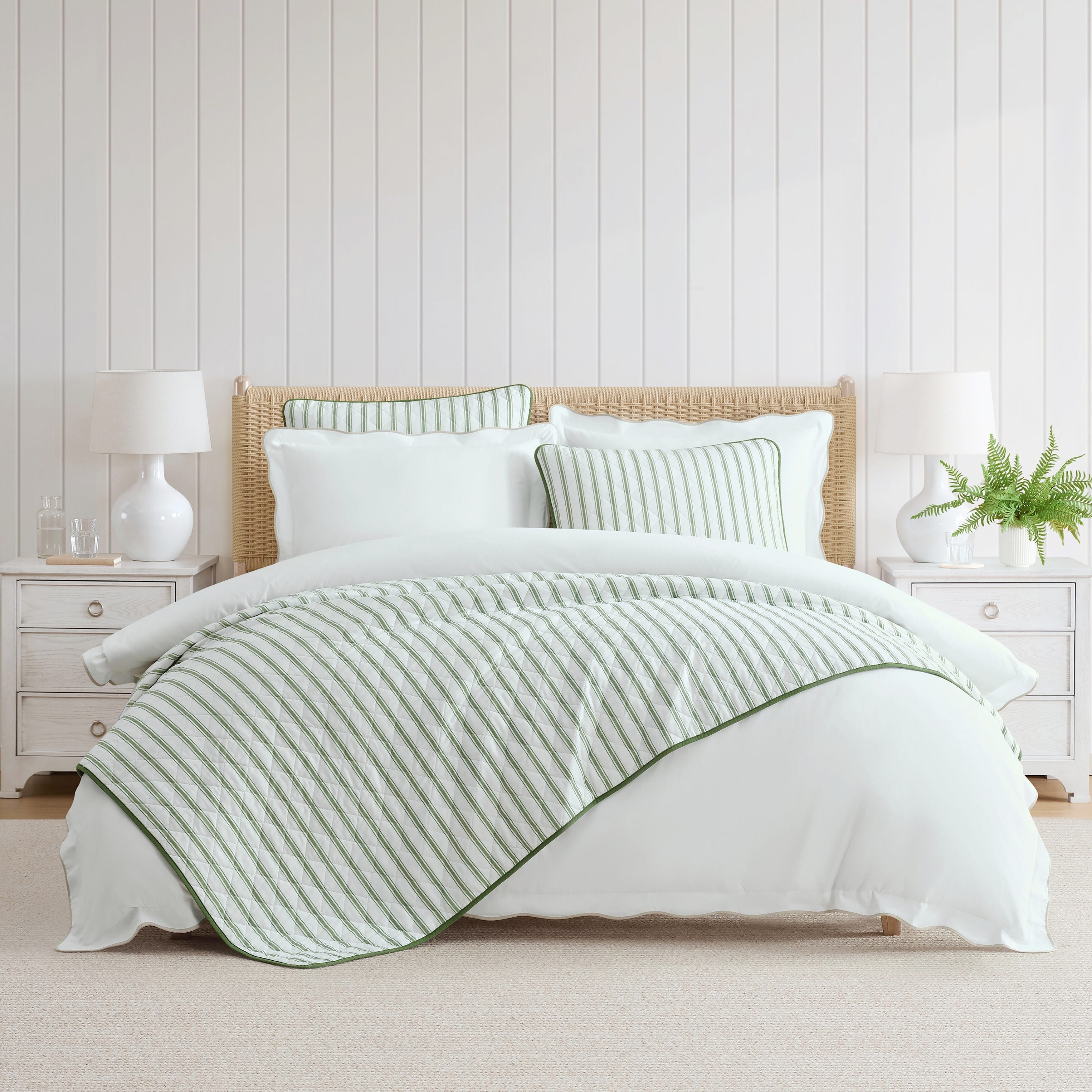Martha Stewart Ticking Stripe Cotton Reversible Green Quilt Set