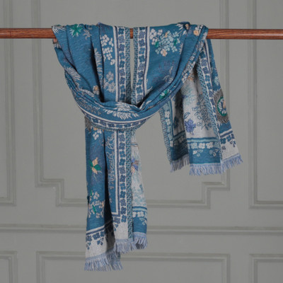'Blue Hand-Embroidered Jacquard Floral and Leaf Wool Shawl'