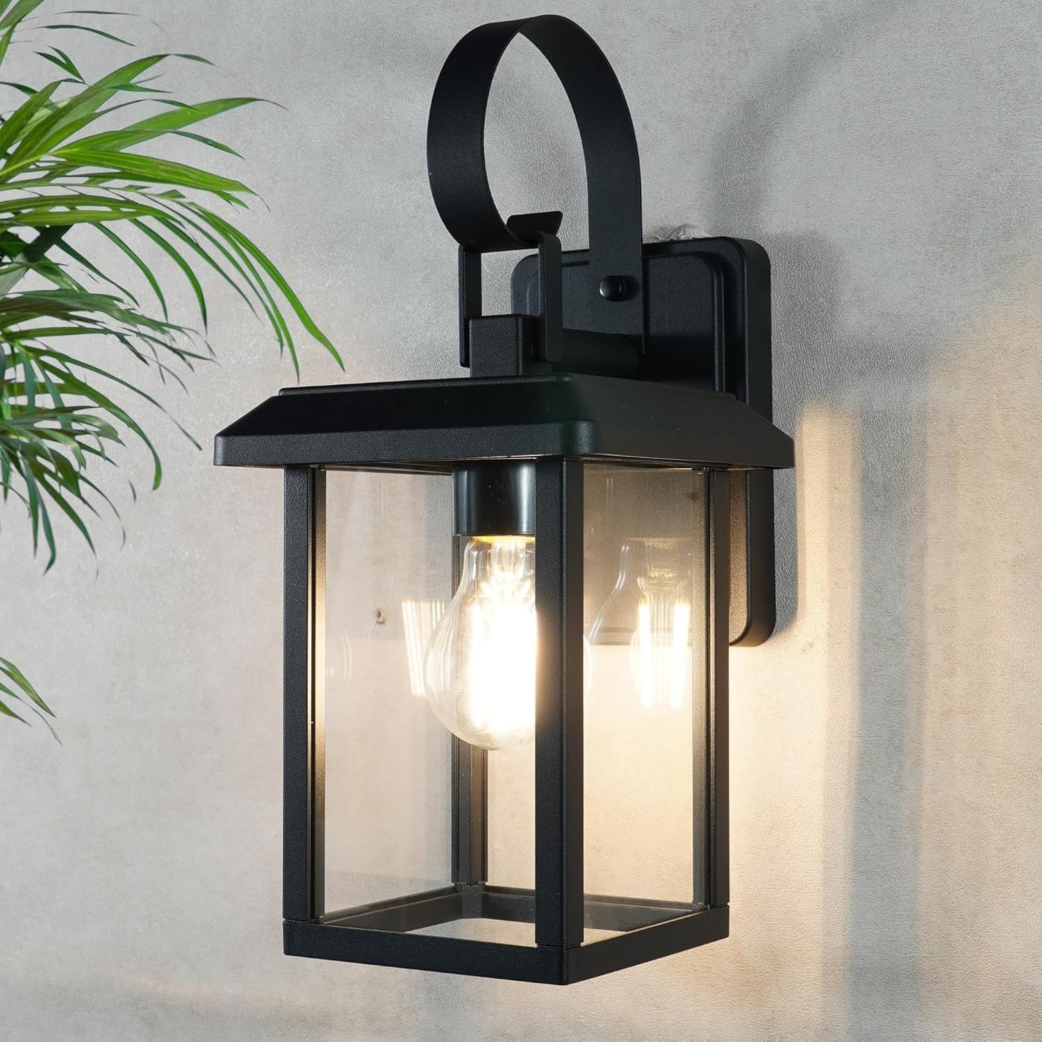 Modern Farmhouse Dusk to Dawn Outdoor Glass Wall Sconce Black Patio Lantern - L6.5" x W7.7" x H12"