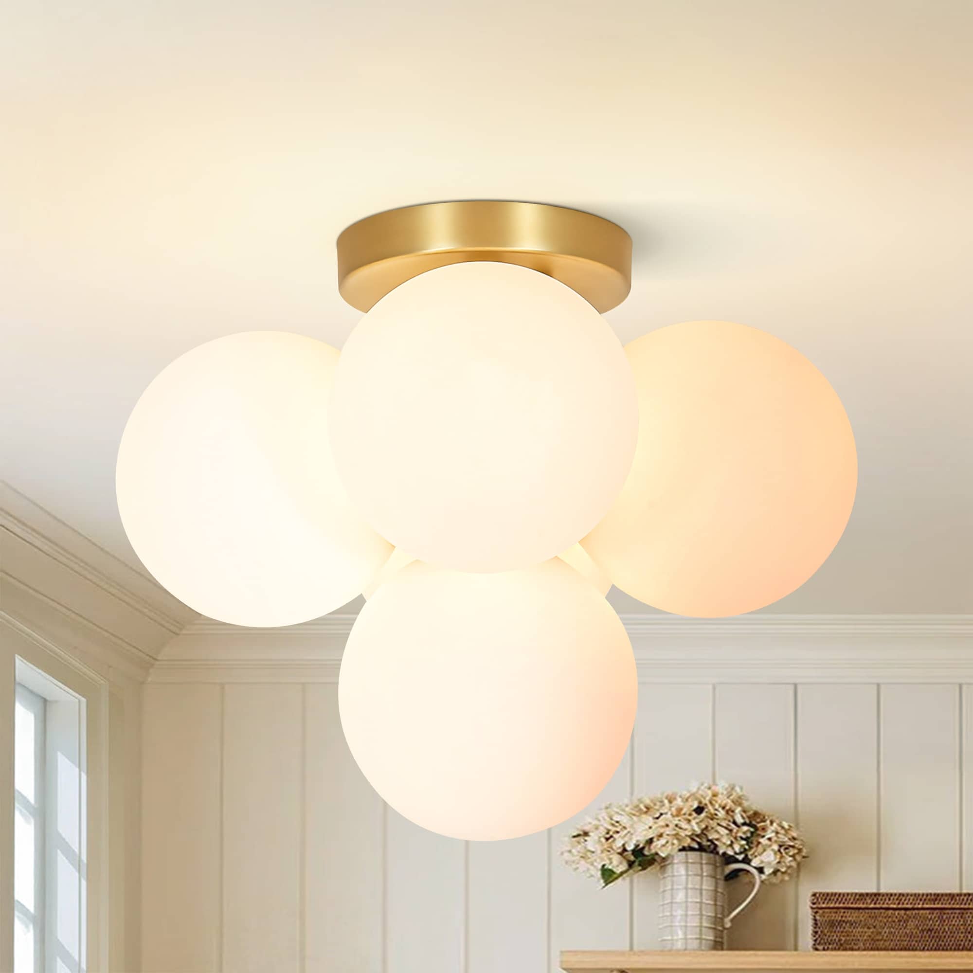 5-Light Modern Gold Frosted Glass Globe Semi-Flush Mount Light - 15 in. diameter × 12.2 in. height