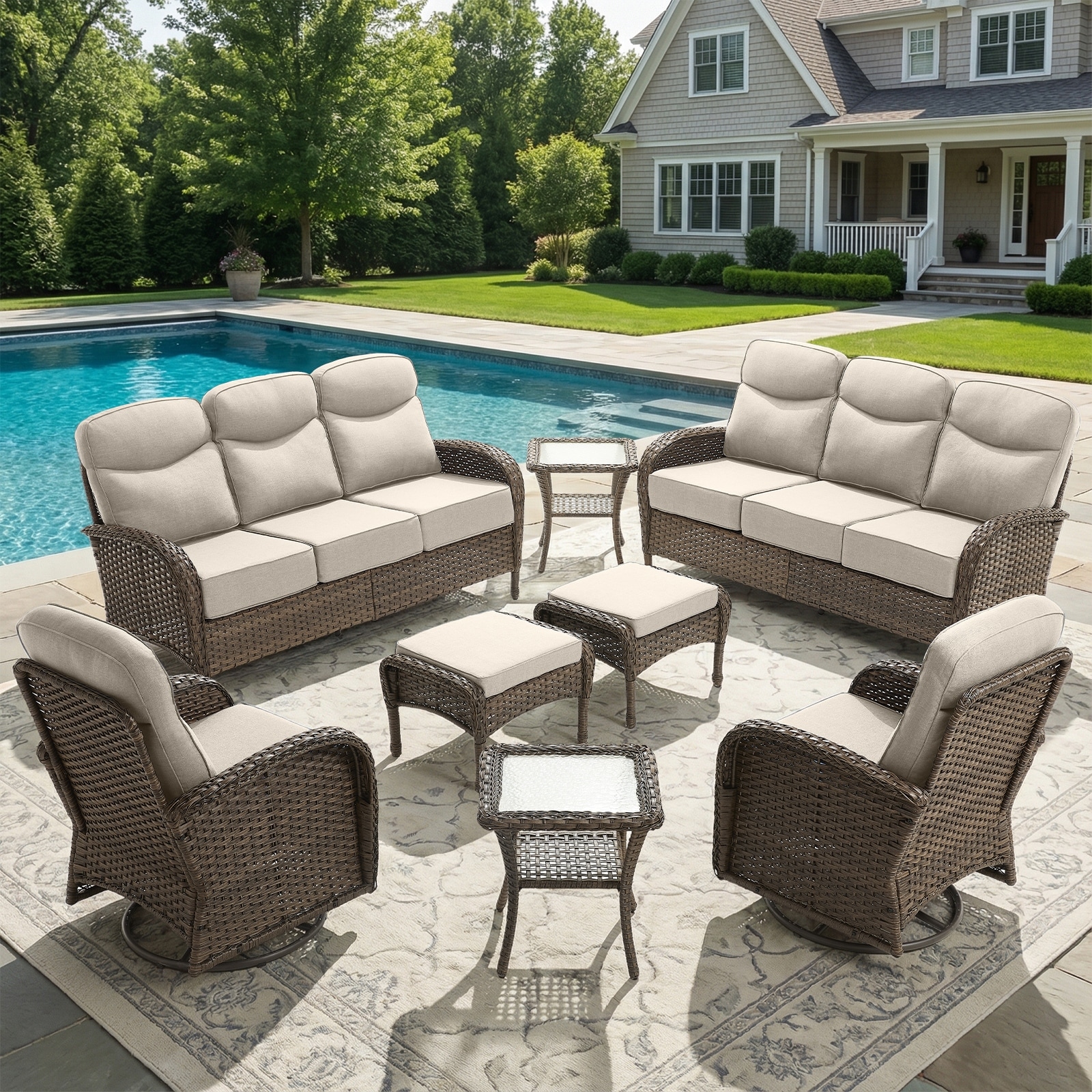 Pocassy Patio 3-Seat Sofa Swivel Chair Table with Ottoman