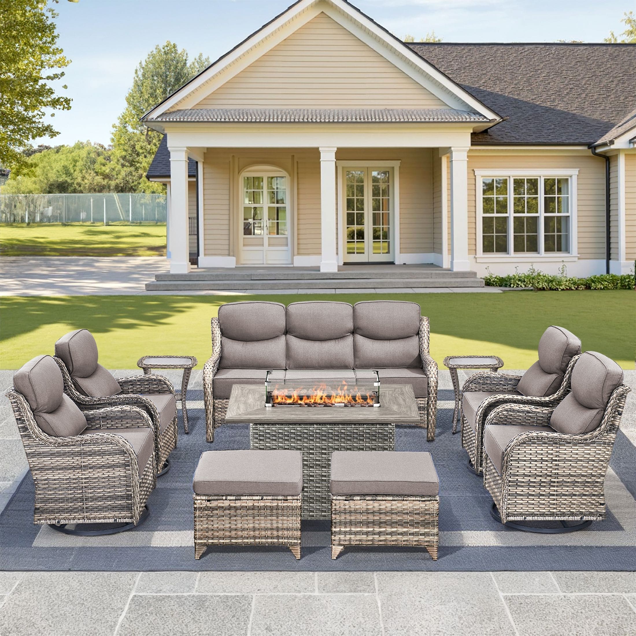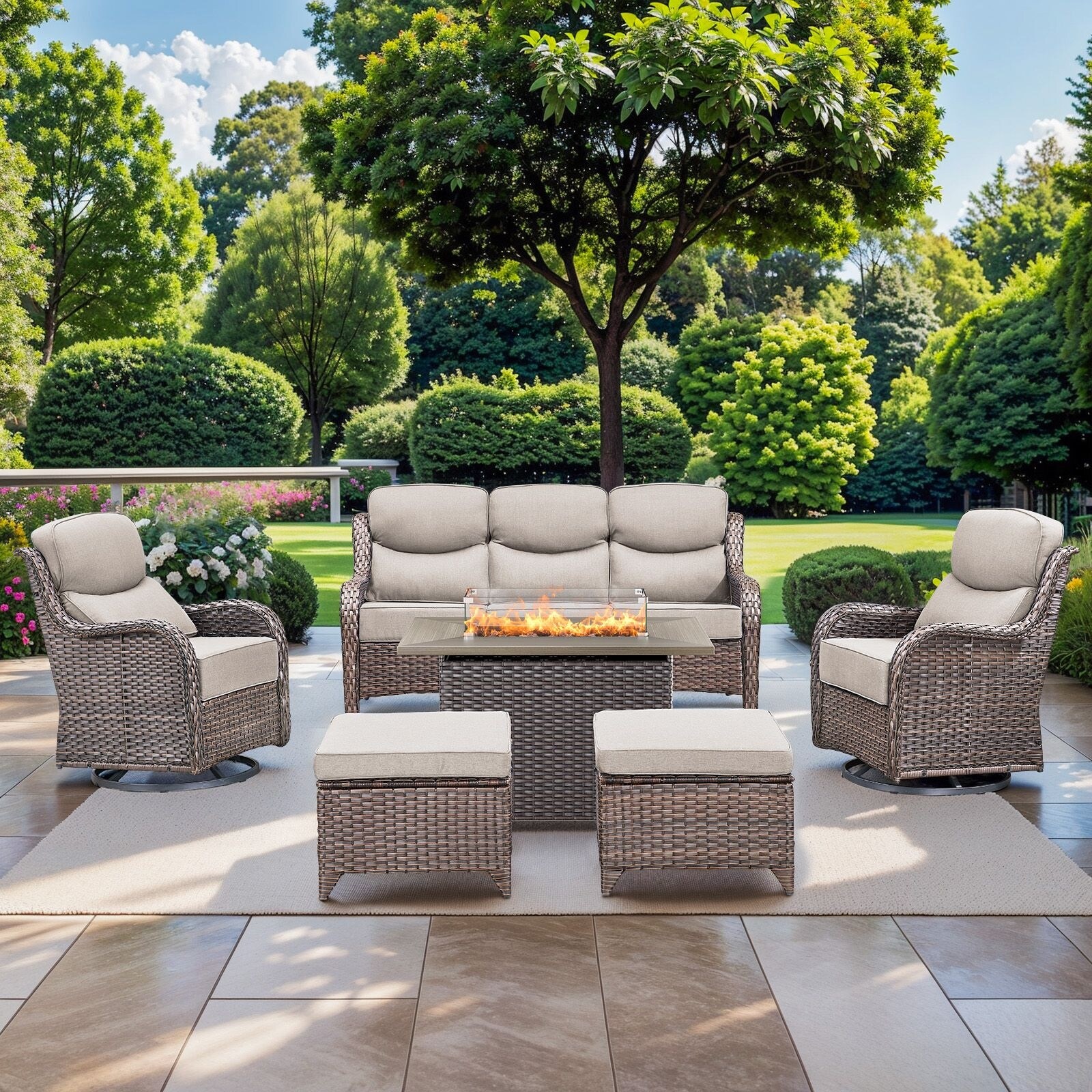 Pocassy Outdoor 6 Inch Sofa Chair Ottoman with Fire Pit Table Set