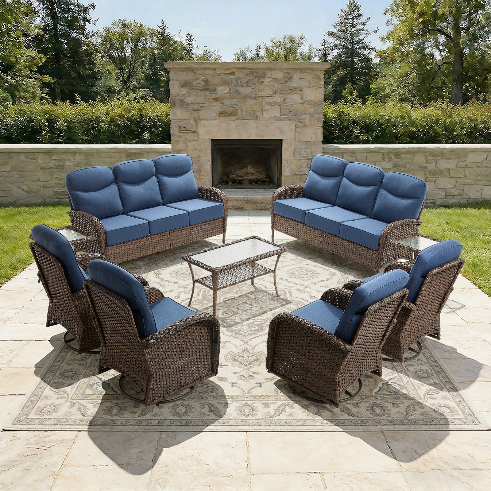 Outdoor Sofa with 2 Swivel Chair and Glider Sofa - Blue cushion - Brown