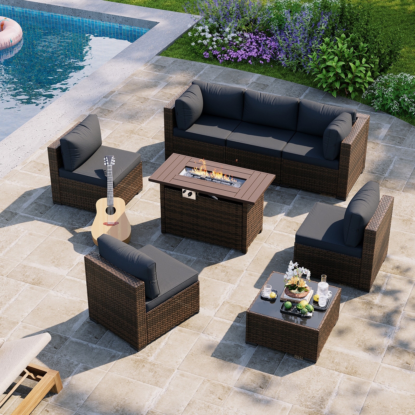 7-Piece Outdoor Deep Seating Sectional Wicker Patio Conversation Set with Fire Pit