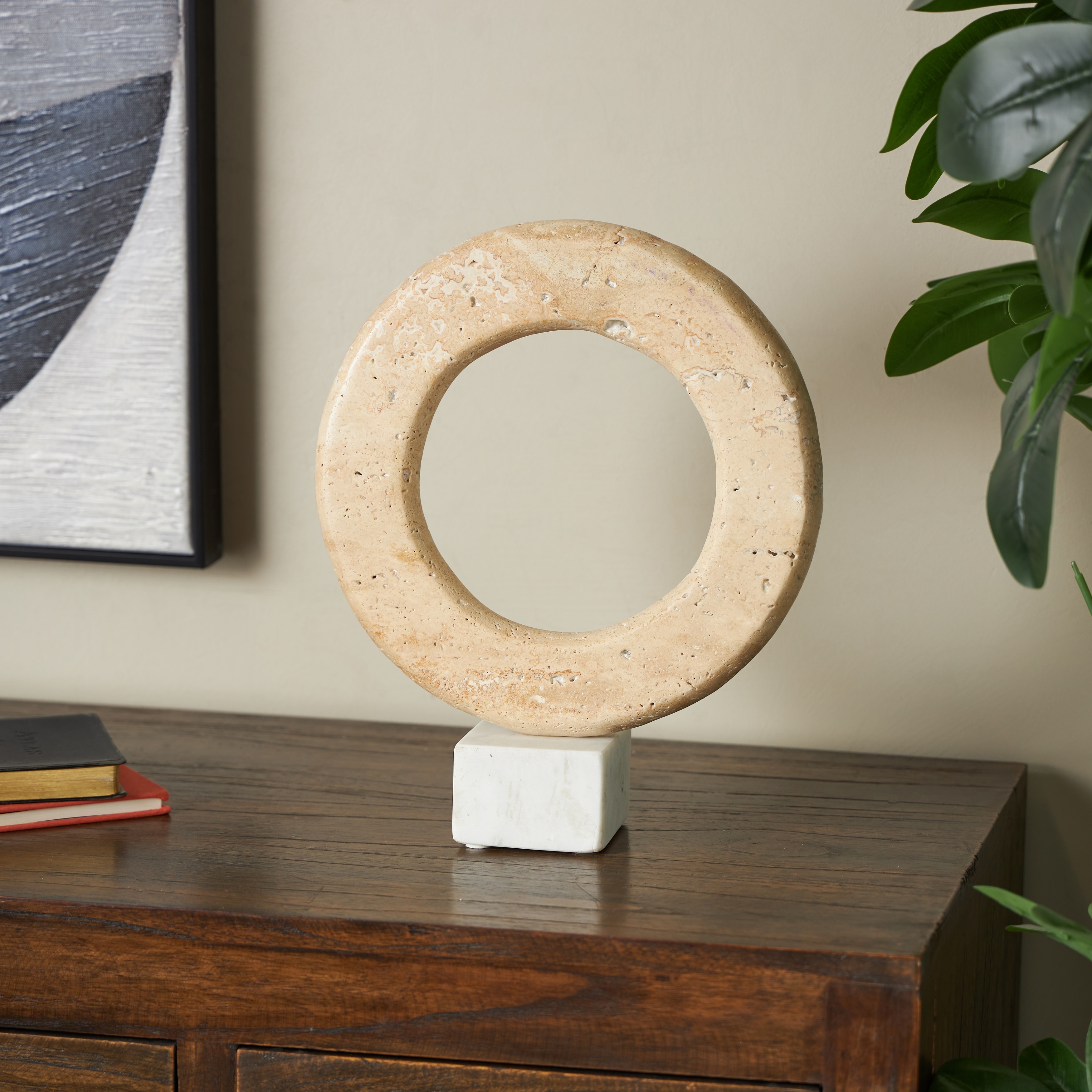 Cream Marble Ring Abstract Decorative Sculpture with White Base