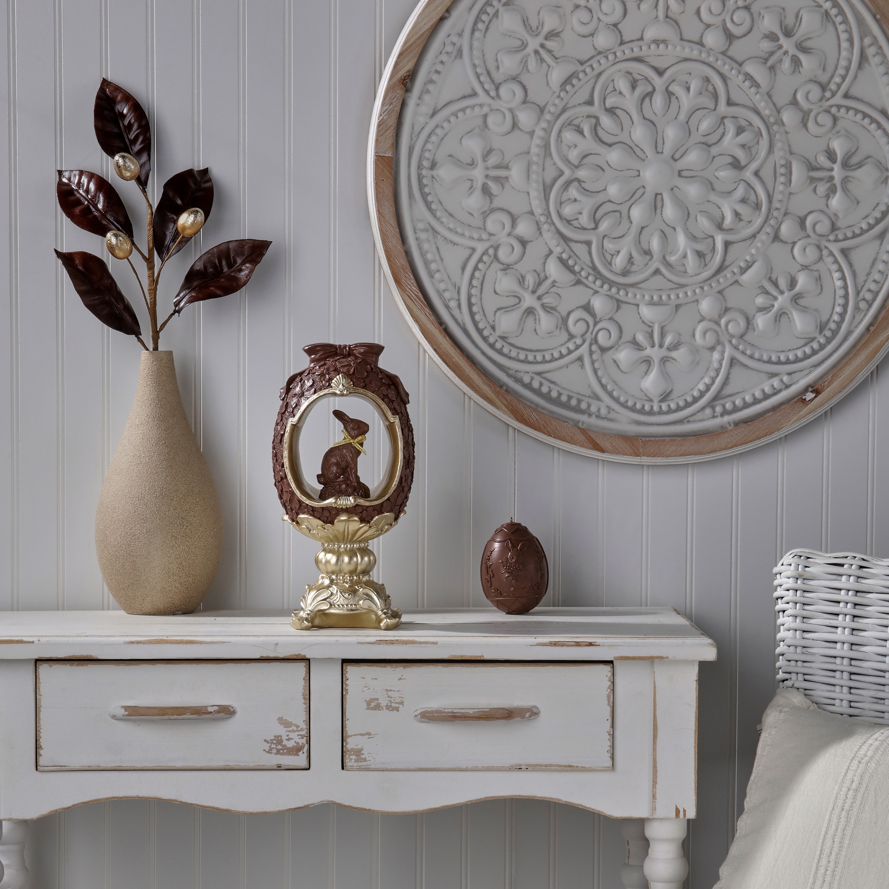 12" Resin Chocolate Egg On Pedestal With Bunny
