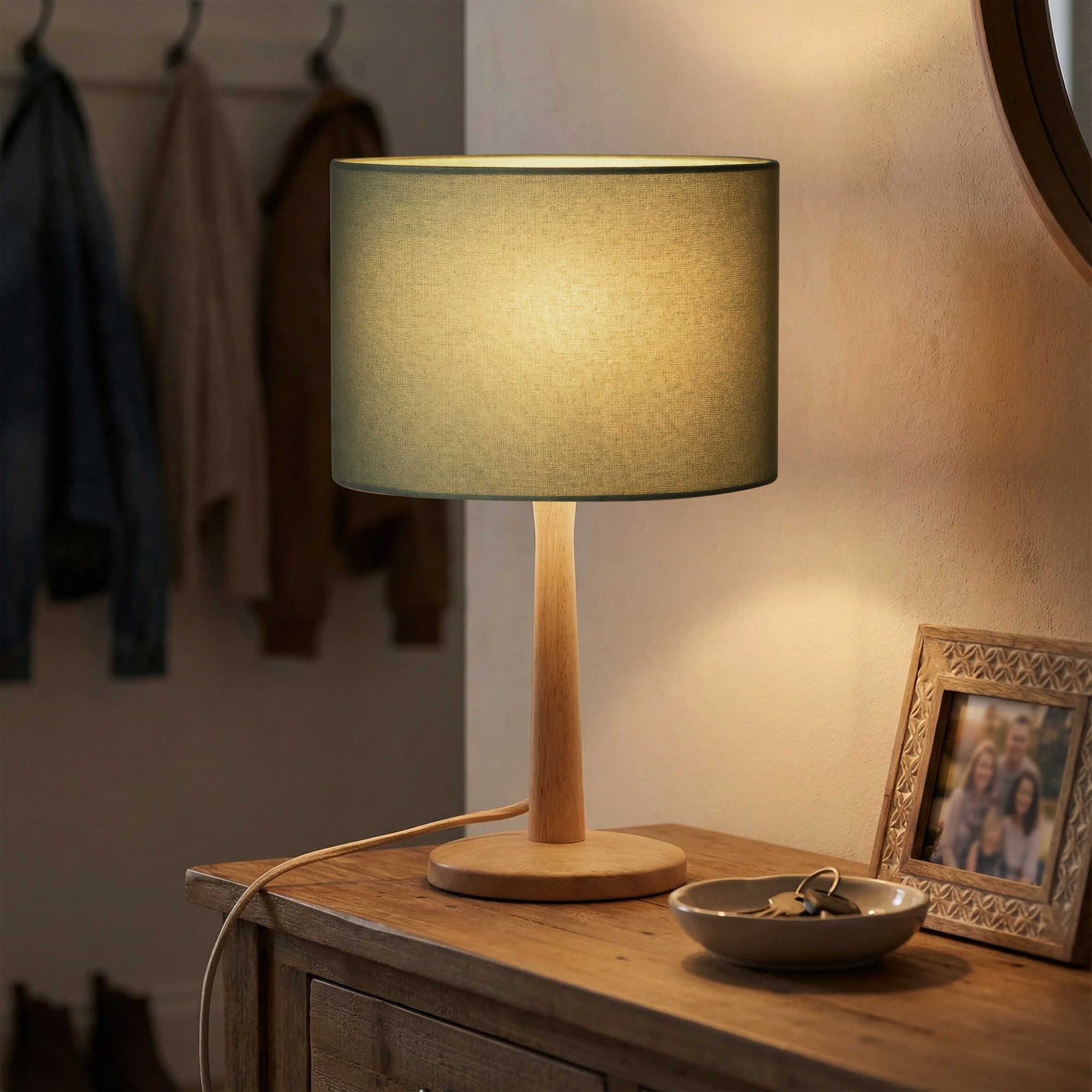 16.3" Modern Table Lamp with Natural Wood Base, Linen Fabric Drum Shade for Bedroom, Living Room, Nightstand