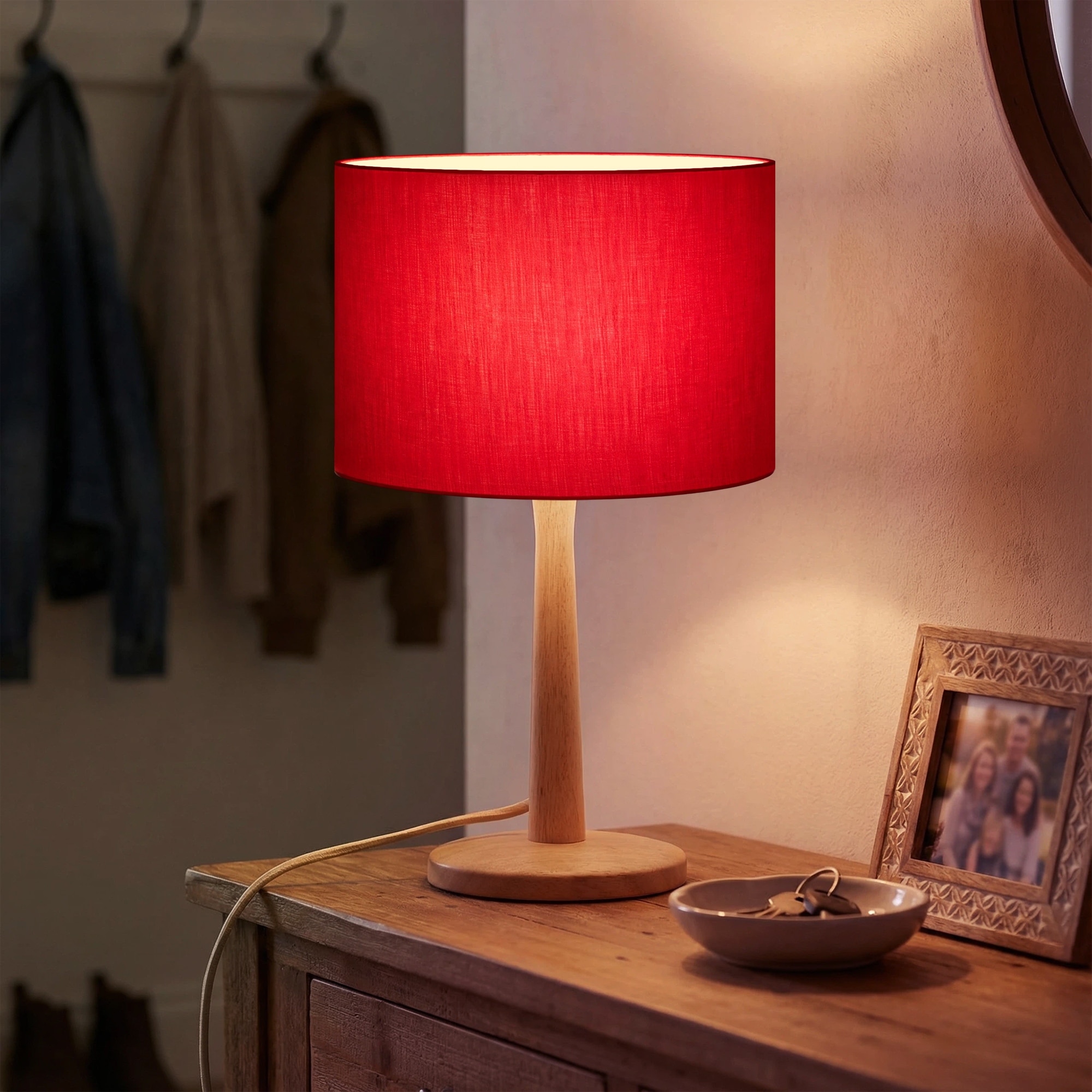 16.3" Modern Table Lamp with Natural Wood Base, Linen Fabric Drum Shade for Bedroom, Living Room, Nightstand