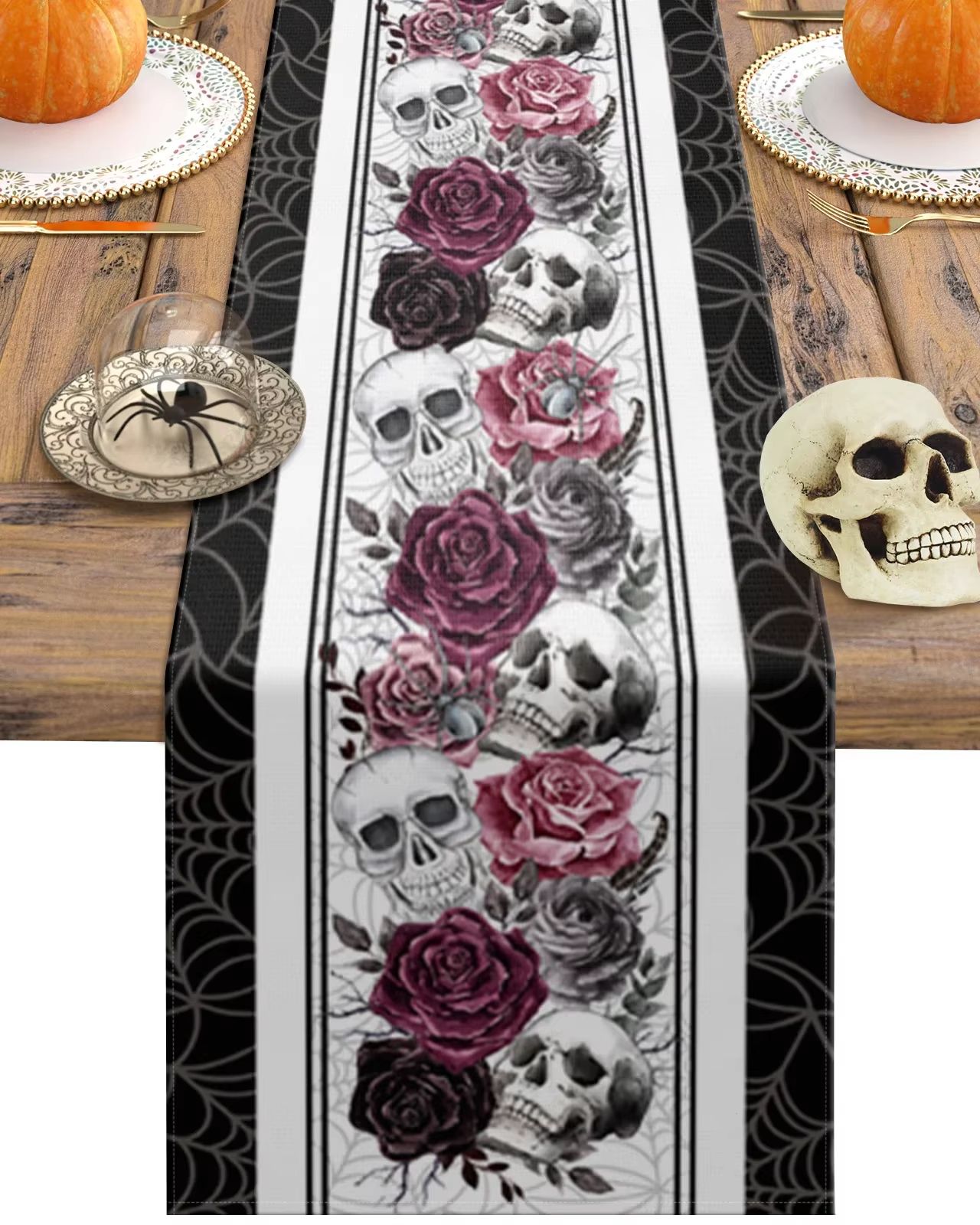 Halloween Skull Rose Crow Linen Table Runner Gothic Party Dining Table Decor 79x13inch