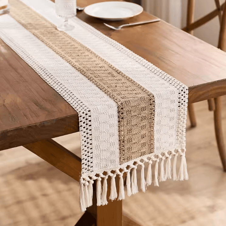 Boho Macrame Table Runner With Tassels Cream & Brown Farmhouse Linen Table Decor khaki With Tassel 30x180cm