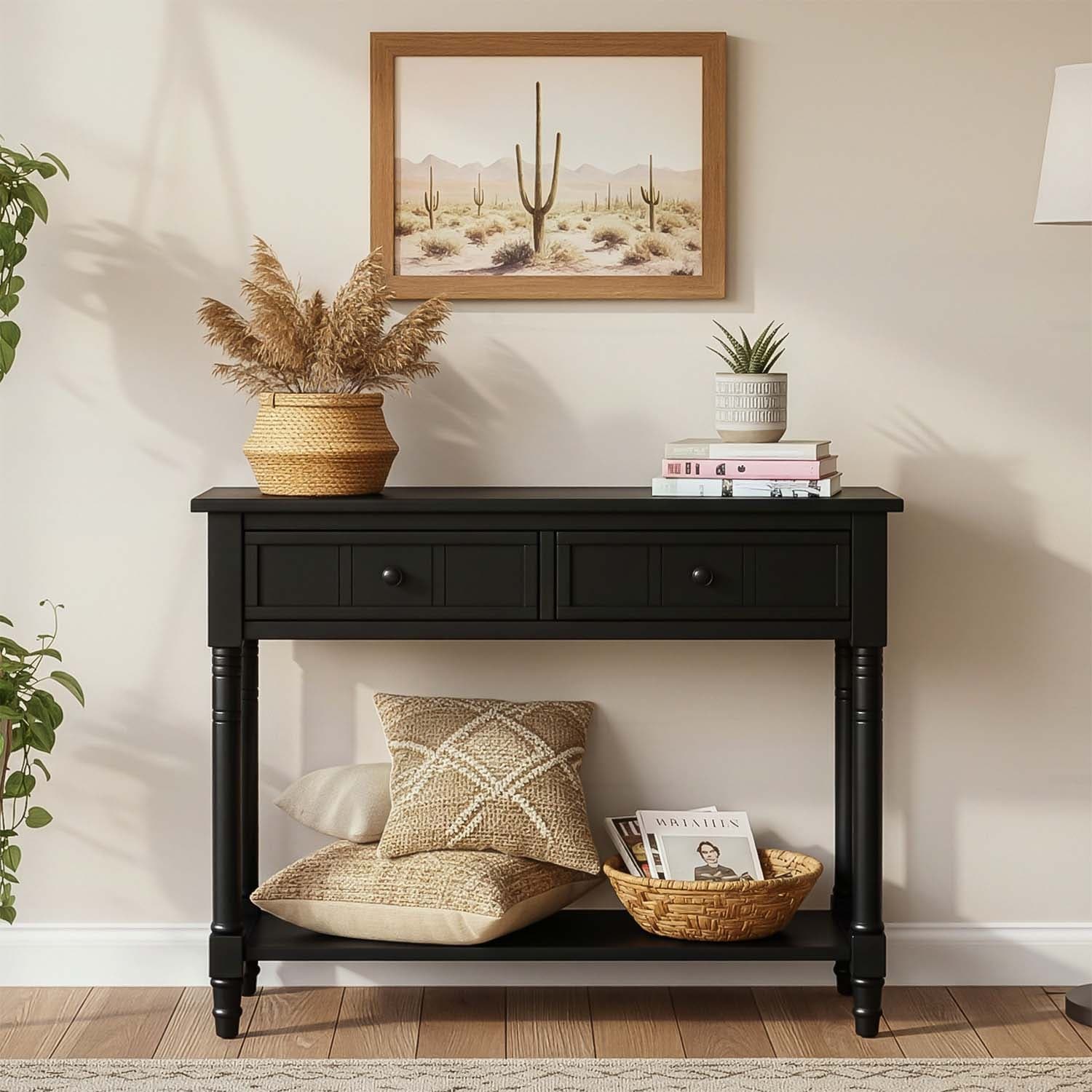 Traditional Console Table with Two Drawers and Bottom Shelf.