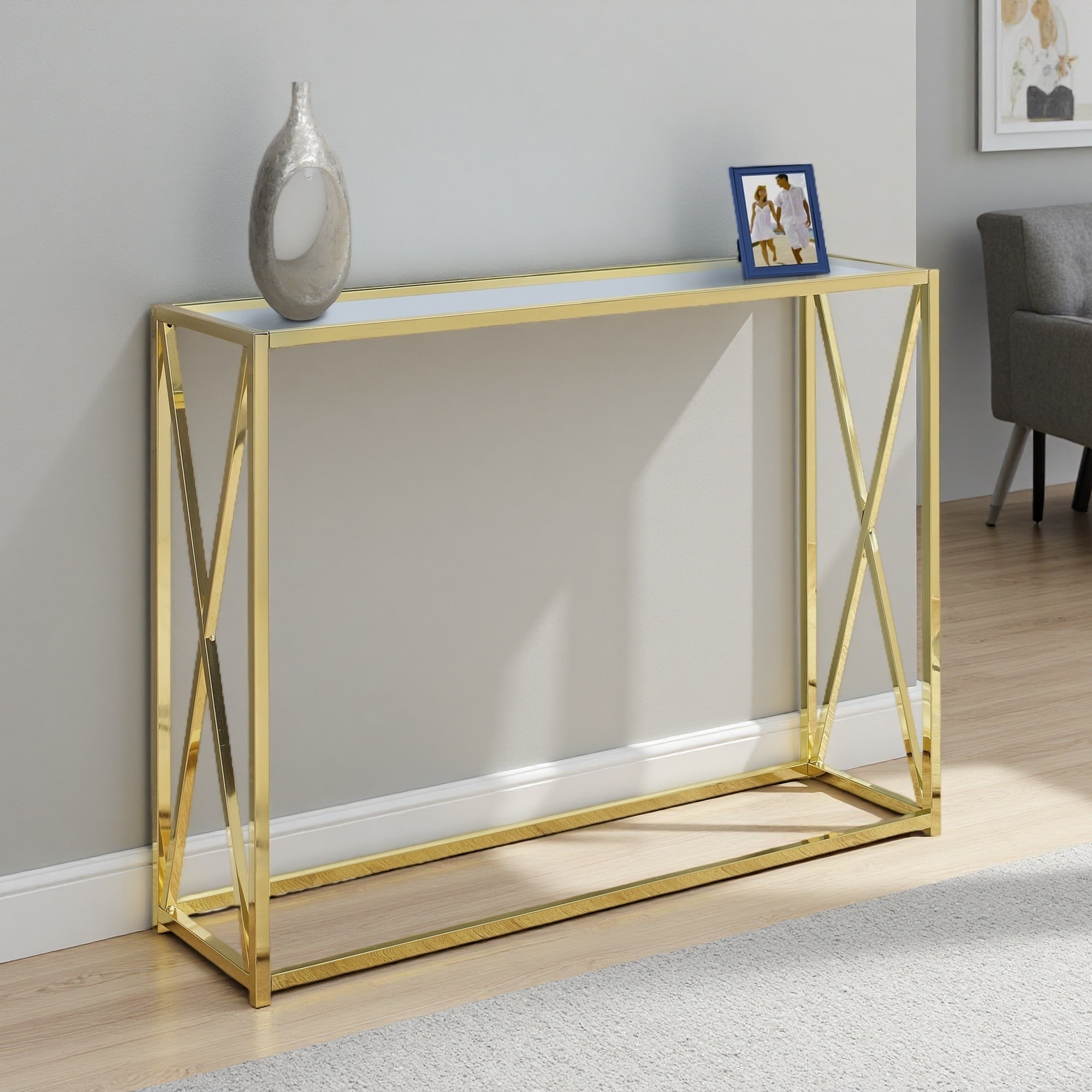 42-Inch Clear Tempered Glass Top Gold Metal X-Design Multi-Functional Console Accent Table for Living Room, Entryway,Bedroom