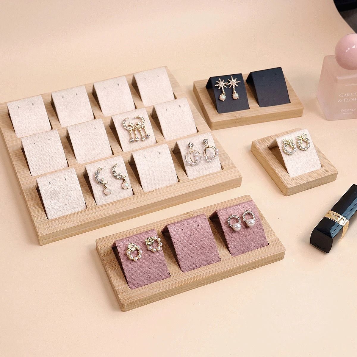 Bamboo Wood Earring Display Stand Velvet & PU Leather Jewelry Tray 12 Grid Beige